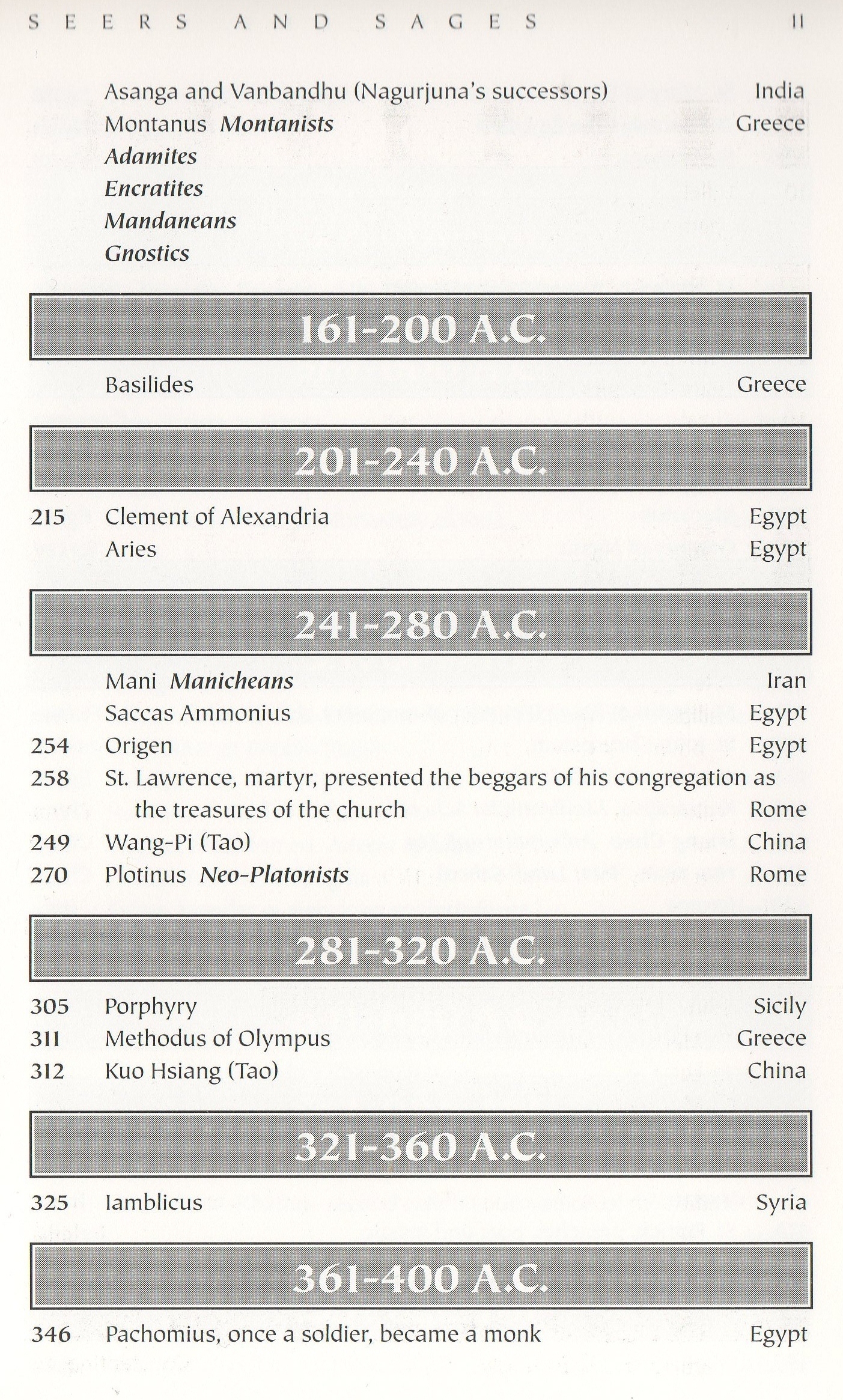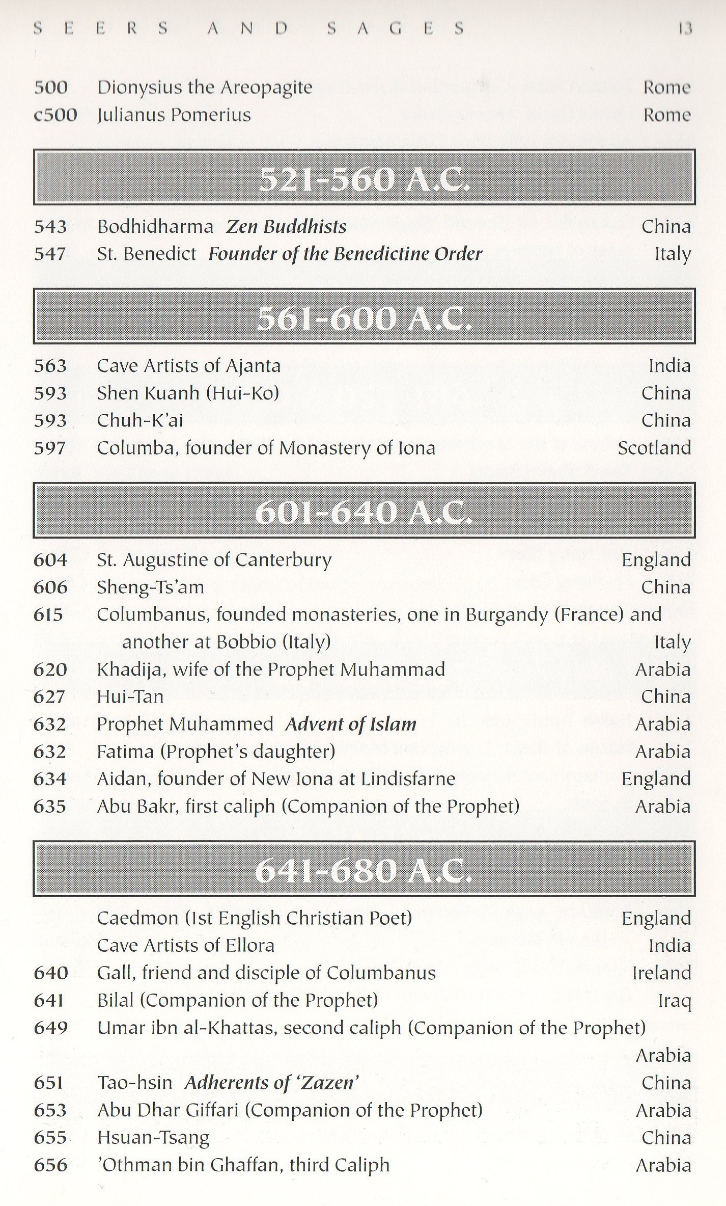 Seers & Sages (600 BC to 1850 AC) “We present here under 40-year cycles from the sixth century B.C. to the nineteenth century A.C the names of both the well-known and lesser known sages, mystics and sufis drawn from all over the world, and also mention, wherever necessary, the schools and the orders they or their followers created. By looking at one cycle, one can notice names from East to West and discover how at one and the same time there were people, scattered in different parts of the world, yet all united in their work to bring to mankind a higher level of awareness. For centuries we were locked up in one particular spiritual geography and history. Now is the time to move from all modes of narrow spiritual patriotism and participate in a broader communion with the elevated souls of all humanity.