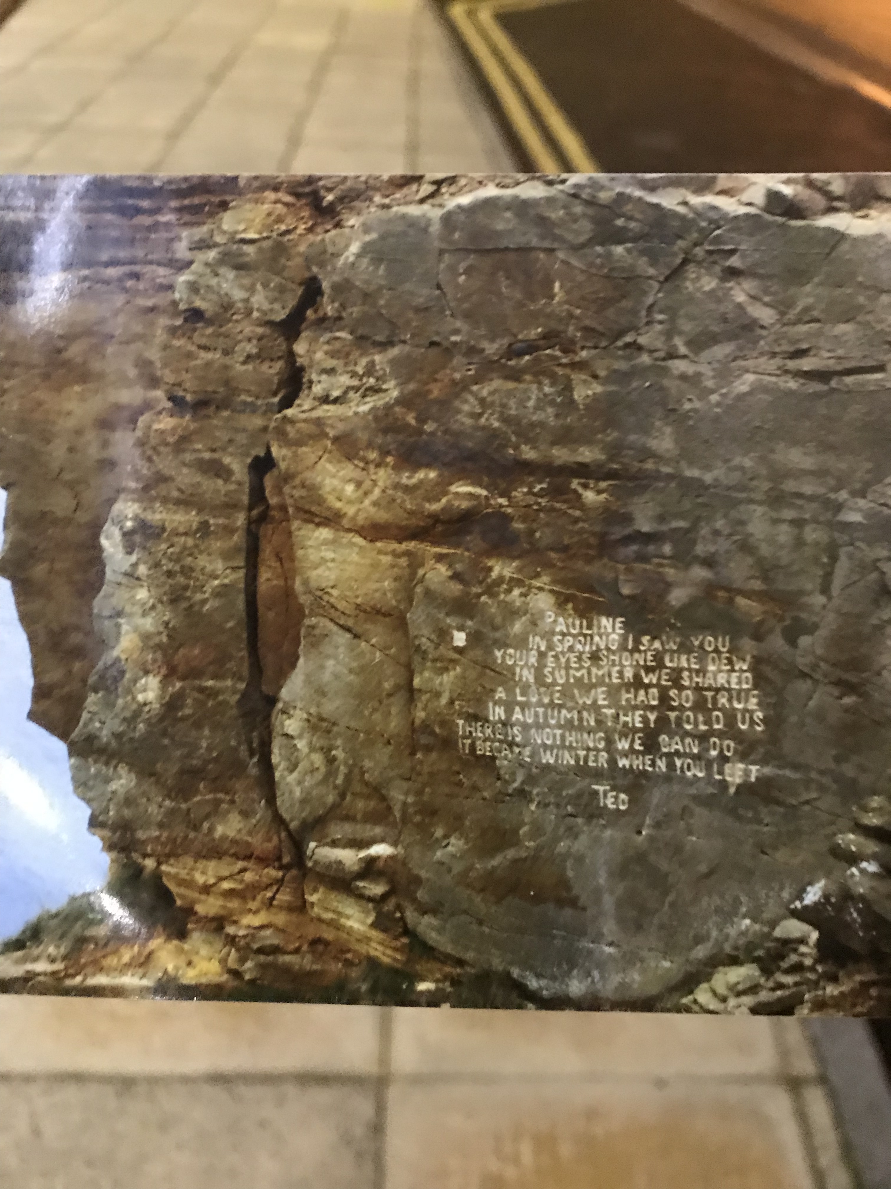 He showed me a fading picture of his love, Pauline. He carried it always near his heart after she had sadly passed away. She was beautiful. I said hello Pauline. There was another photograph. It was of a rock face on a cliff. I asked what is the writing on the rocks?